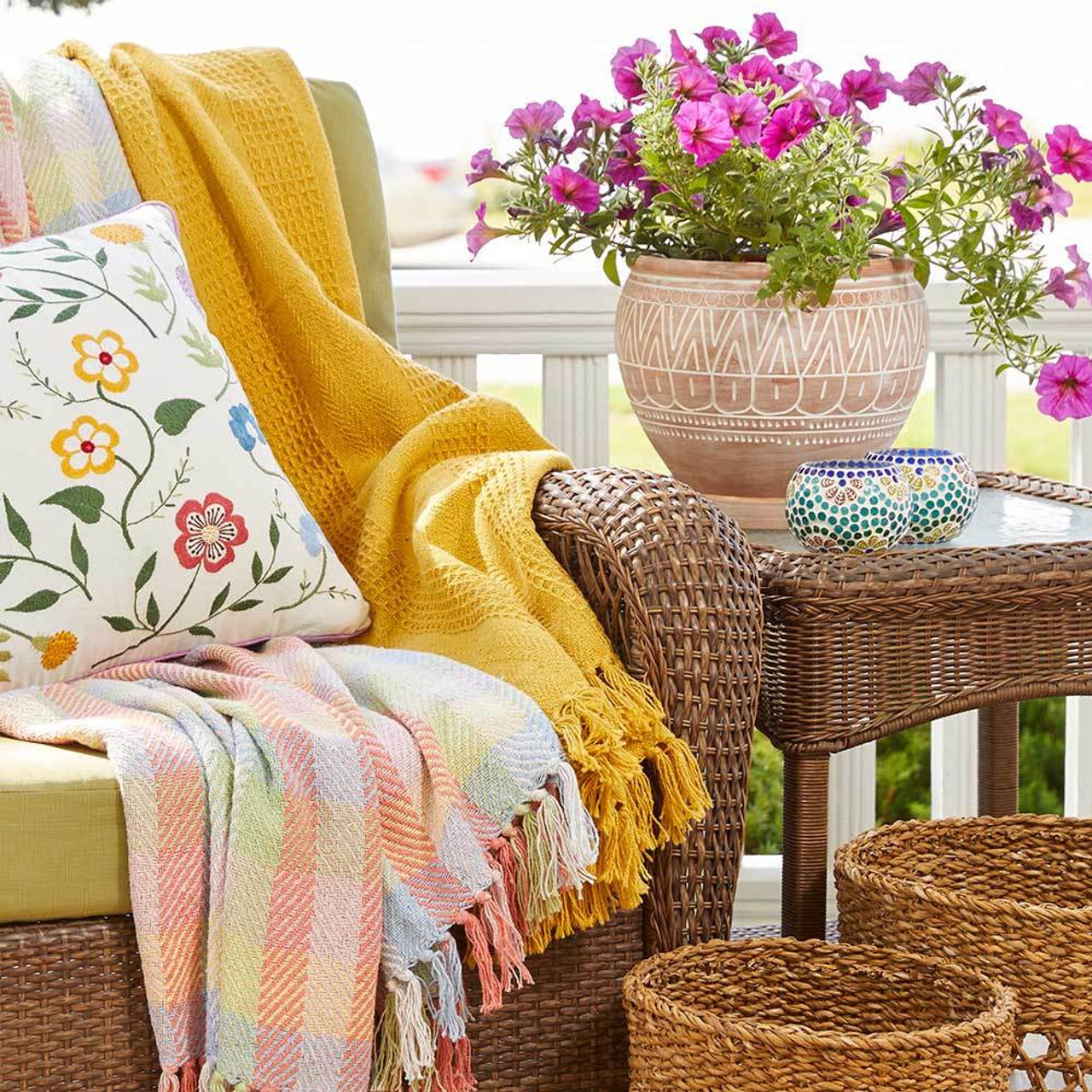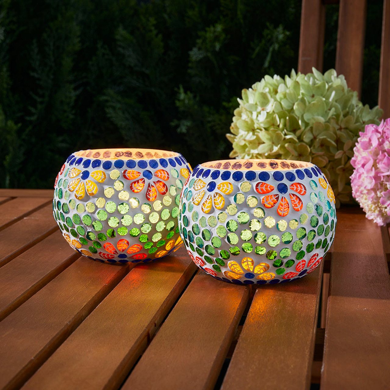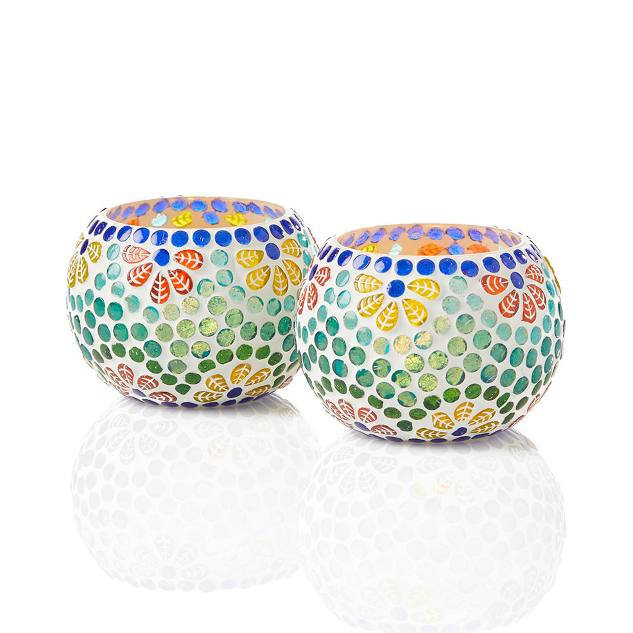 White ceramic is studded with colorful glass in a cheerful floral pattern to craft these unique candle holders. For a colorful spring glow, pair with LED tea lights or votives (not included). Set of 2. Dimensions: 3″h x 3 1/2″dia