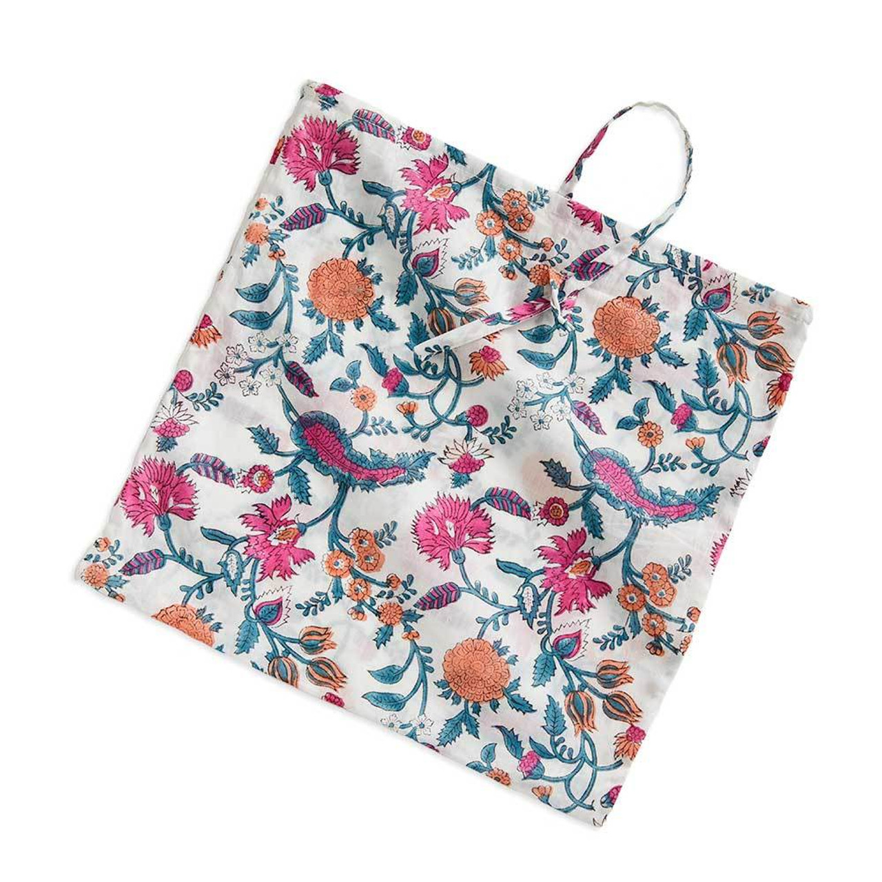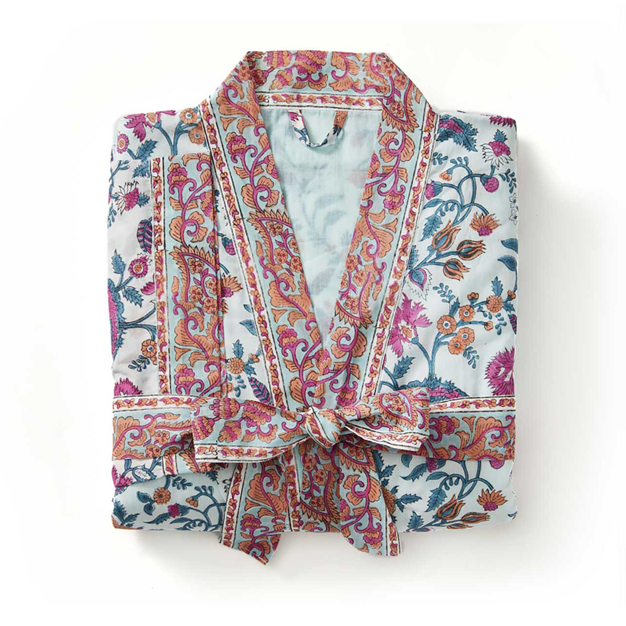 Relax in lightweight comfort with this unique spa gift from India. Each hand block-printed cotton robe features a traditionally-inspired floral pattern in pinks and blues. Comes with matching storage bag. Pair with bath salts or soaps for a one-of-a-kind wellness gift! Coordinating cotton lining. One size fits most. 100% cotton. Machine wash cold, tumble dry low. 37 1/2″l; Neck opening to sleeve opening: 20″w; Sleeves: 10″l; Tie: 78″l