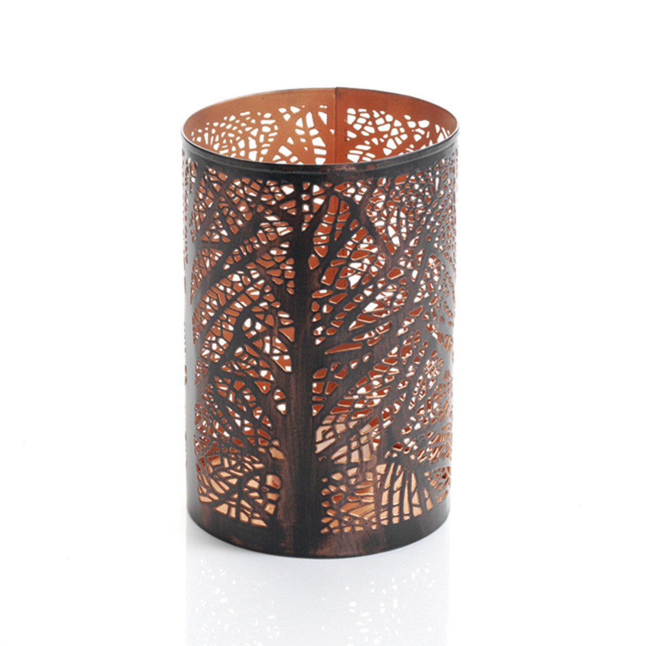 Light shines warmly through the intricate openwork branches of this copper-plated, partially recycled iron candle lantern. For use with votive or LED tea light (not included). Pair with our other River Birch Lanterns for a rustic display! Dimensions: 6″h x 4″dia.