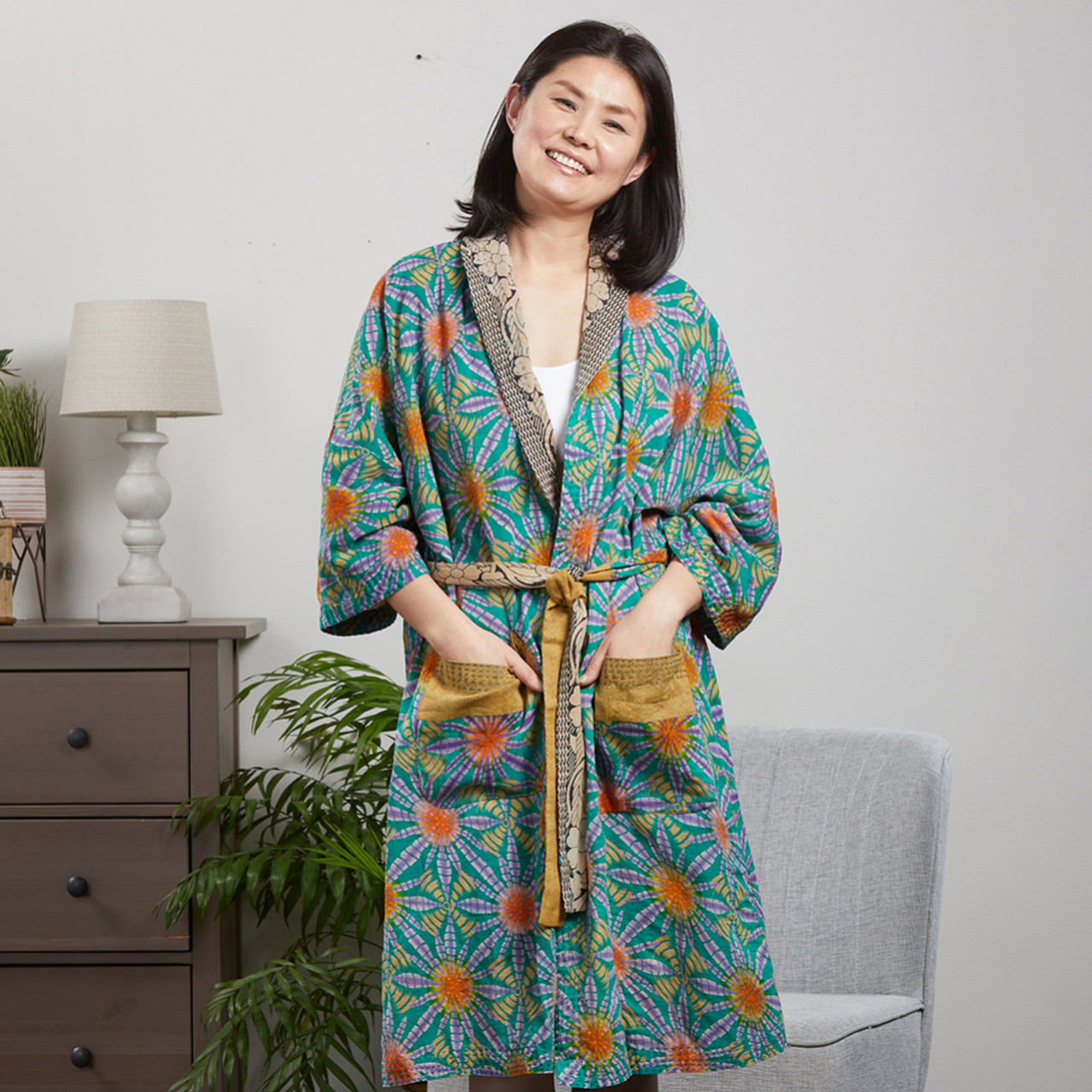 Relax in eco-conscious style with a sari robe that’s as unique as you are.